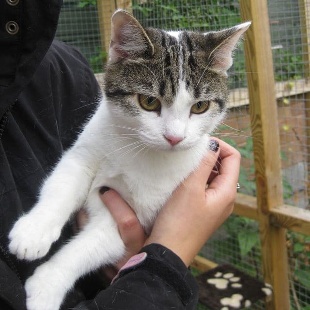 Some kittens are shy and timid with new people but Bo, who came in to us recently, isn’t an affectionate and friendly young lady. She’s about six months old, half grown but still a kitten in her ways and behaviour. She is a spotlessly clean young lady, a tabby and white with the most pristine clean and silky coat you could ever find.