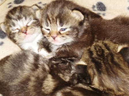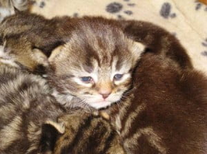 These little kits were born two weeks ago and just have their eyes open. There are four of them and alike as peas in a pod! They are all ‘mackerel’ tabbies and stripey, just like little fishes. This is a quite rare and beautiful coat marking. Most have white bibs too so they are very smart. Their mother is a wild cat who was dumped here, we found her wandering around outside. She is a lovely creature, black and fluffy and has only just become tame. I coaxed her indoors first and then managed to get her into a pen.
