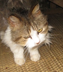 She may still look a wreck but there are definite signs that Misty is improving. She’s livelier and has been out in the sun for a little while today. She doesn’t feel so feverish so the antibiotics are doing their work and she is eating well. There must be some discomfort in her eye though as she holds her head on one side some of the time. At least if she is in better physical shape the vet may be able to operate if he thinks it necessary.