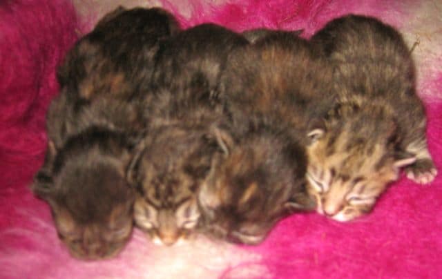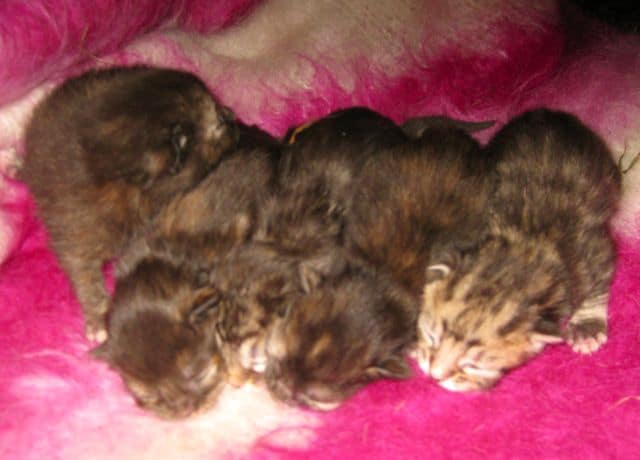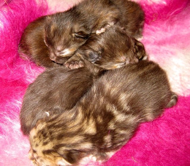 Jasmine delivered her kittens safely on 21st April, we’d had one or two false alarms where I thought she was kittening but she was just having a lie in! She’d chosen her spot and made a nest in a nice cosy box and had lots of soft blankets and the mohair jumper she especially likes. Jasmine didn’t come out for breakfast, nor dinner. I could see that she was alright but didn’t want to disturb her.