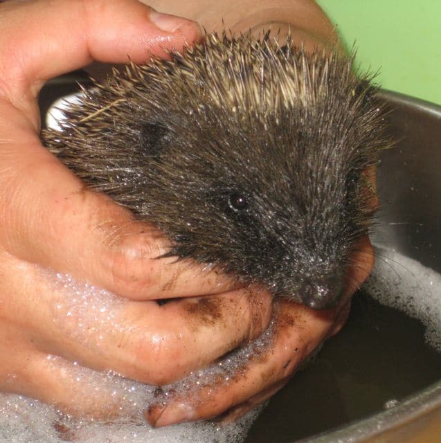 Every day is different in the sanctuary and yesterday was more unusual than ever. We’re used to rescuing hedgehogs but not when they’re covered in oil!. These prickly little creatures are notoriously adventurous but this one went too far from home and wandered into a car workshop where he promptly fell into the repair pit. He was covered in oil and had to be fished out by one of the workers. He was kindly brought in to us for a clean-up job. It wasn’t possible to leave the oil to wear off because hedgehogs self anoint and if he’d ingested some of the contaminant that would have been it and he wouldn’t have survived.