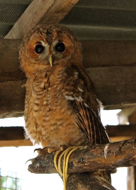 Ozzie loves his aviary and likes to perch on the highest branch. He is nearly fully feathered now, only a few fluffy feathers left. Chicks are his favourite meal, we buy them ready frozen and defrost several every day for him. He has a good breakfast and then we top him up with chicks in the evening. The idea is to try to mimic his natural feeding pattern. At last he’s eating whole chicks on his own, no more cutting them into little pieces and hand feeding him! He is a proper owl now and swoops on to the chick and picks it up in his talons, which are very powerful, and takes it off to a branch to sit and eat it.