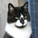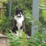 Patrick is a handsome black and white cat who has been living at the sanctuary for several years. Where did he come from? Nobody knows. This boycat suddenly appeared, he was wild at first and we couldn’t get near him. There was no chance of putting this fella into a pen and picking him up for a cuddle. He stayed around though and made himself at home, going in to the kitchen for biscuits and and eventually having a snooze curled up in a cat bed. He seems to be still a young cat, although he is very laid back, he is agile and deceptively innocent – this cat is the best mouser ever! He’s like a basking shark, lying around all day, posing for photographs, showing off his best side and his nice long whiskers – then the next moment he’s off on the chase. Mice and rats beware, Patrick has an enviable success rate and completely dispels the myth that male cats are couch potatoes. If the rodents decide to venture in to any of the outbuildings, Patrick will clear them off with skill and cunning. All cats are different and Patrick is an exception to almost every rule. No fuss or frolics from this serious thinker – his is a silent unfussy nature with not a meow so far. While he has no particular friends and doesn’t seem to pad round with us like many of the others in our extensive cat community, wherever we are, he suddenly appears – and always he is posing. One of his favourite spots is balancing on the gate post next to the cattery – or he’ll place himself by an attractive fern or sit by a clump of lavender, this cat is so stylish and suave, he’s almost unreal! Because he seems to get some of his diet from his hunting skills, he isn’t so bothered about the food we put out – pouches are for sissies! He’s deferential to the the lady cats, they can go first but he is alpha male and don’t let the other boys forget it.