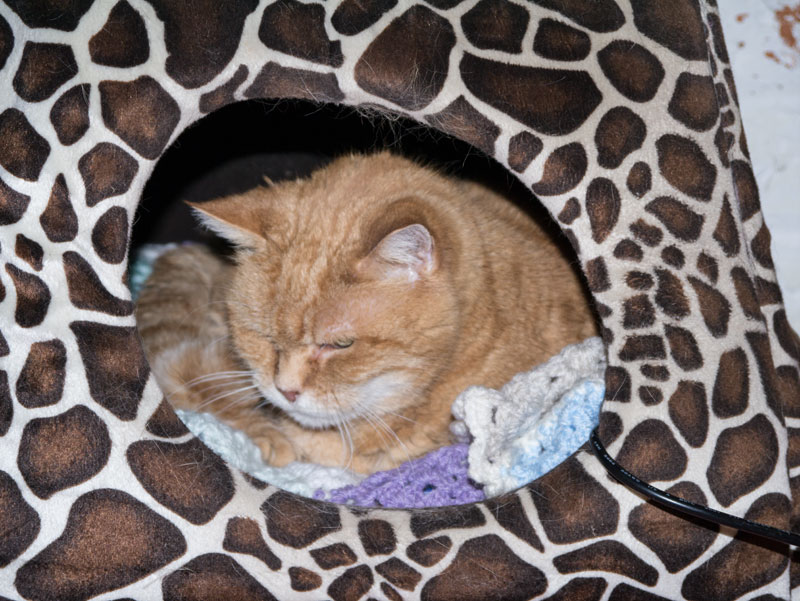 Peaches is another member of our ‘Golden Oldie’ club. At 18years she is our next to oldest cat. This igloo was donated to us and Peaches commandeered it right away. It’s lovely and cosy and warm for her – and she has a heated pad in there as well just to make sure. Peaches is in good health although slightly deaf. She is still as beautiful and as much a character as ever. Peaches came in as a kitten – a little stray found at Heeley in Sheffield. She was a quirky little spitfire of a ginger girl and she isn’t much different now! If she likes you – then she is obsessively loving but if you don’t fit her ideal of a servile human then you will get total disdain, if not an actual claw when you are least expecting it.