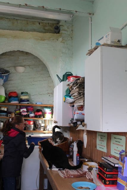 When pigeons come in with injuries we wait till they’ve recovered and then release them. They sometimes hang around for a while and then they fly off. Not all of them do this however. Peppa pigeon was here for about a month before we released her. We thought she’d flown away but not so, she’d only gone as far as the sanctuary kitchen. It has a high roof and a convenient ledge and that’s where Peppa has made her home.