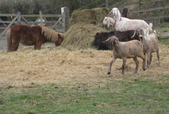 We put big round bales of hay out for the ponies every week and as soon as the goats are let out they run down to eat it with them. The ponies don’t mind, there is plenty for everyone and they are happy to see their goat friends. The goats have only recently started going out in the fields again, they are Anglo-Nubians and obviously remember that they originated in a hot country. These are the biblical goats you can see in old pictures and they like to be warm and dry. Mud, rain, wind, snow, wet – no thank you! It’s not that the goats need to eat the ponies’ hay, they have racks of hay in their indoor pens. Other people’s food always tastes nicer though doesn’t it?