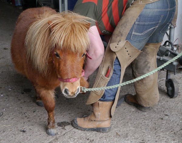 The blacksmith comes approximately every eight weeks. First of all he cuts the hoof off with a special farrier’s knife and then he rasps the hoof into a smooth round shape. The important thing is to have the feet level, otherwise the pony would walk unevenly and that would put a strain on the legs and lead to lameness.
