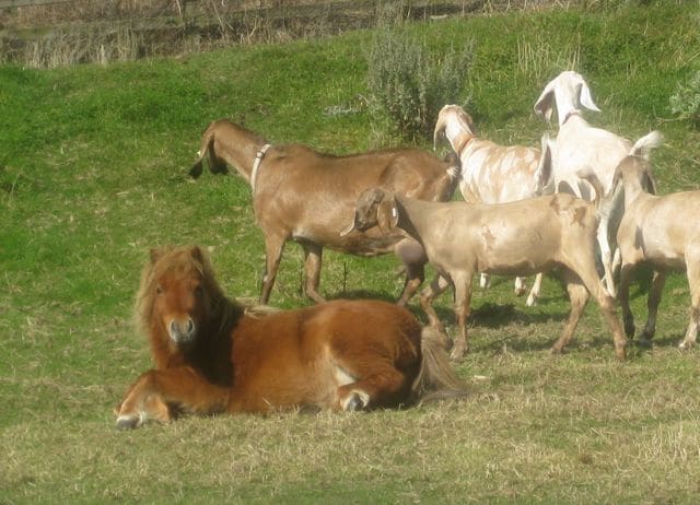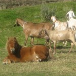 Just when he was having a nice snooze those pesky goats come along! Sundance likes to have an early morning nap but the goats are looking for breakfast and don’t care who they disturb. Bridget is asleep too but just out of the picture. Chloe is the oldest pony in this little group and she stands guard. It’s rare to see all the ponies asleep together, there is usually one of them on the alert and looking out for danger. A horse or pony’s first instinct is to flight, a memory of the wild days when there were predators hiding in the bushes and up in trees and ready to pounce on an unsuspecting plump little pony. Although how far Sundance would get on those little legs is hard to imagine.