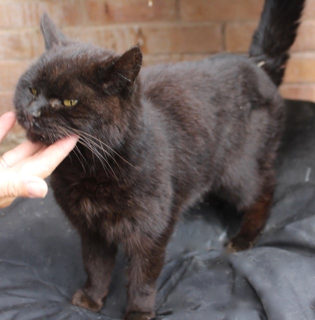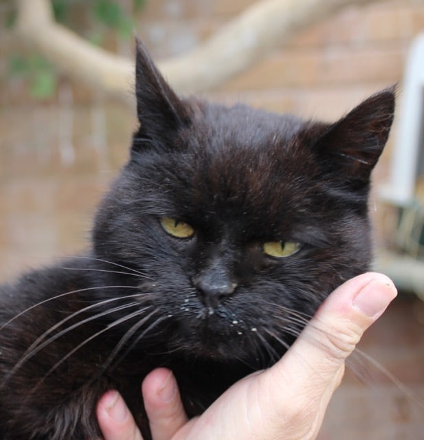 Jet hasn’t been grooming herself and is raggedy looking even though she’s a smooth haired cat. Her coat is dull and ‘staring’ which means it sticks up and isn’t glossy. Although her face looks plump it is only fur and the rest of her is bones almost sticking out of the skin. How old is she? In her teens we think but not so old that she should be in this bad sat te. She’s become very run down.