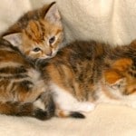 Here she is sitting with a friend who is a bit older. Dolly is a calico kitten who was in one of the first litters born this year. She was tiny and frail and took a while to get going. She has joined the tinies and will go for her vaccination along with them as she is only marginally bigger, even now. She is becoming very adventurous though and has just learned to climb.