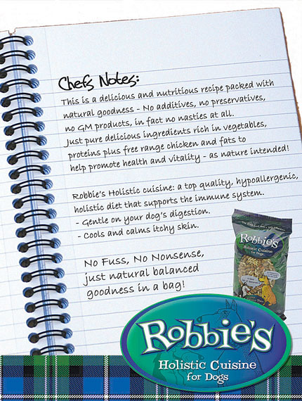 We’ve used Robbies to treat all sorts of health problems in dogs with fantastic results. As far as dog food is concerned in most cases it is either open a can or a packet, pour in bowl and your job is done – Dog fed! Convenience is the key. Well, Robbie’s Holistic Cuisine requires just a little bit more effort and the reasons for this lie in the quality. Most of the ingredients are ‘Dehydrated’ which means they have had the water removed and before feeding it needs to be replaced. This is where Robbie’s ingredients come into their own. Dehydrated foods is the oldest form of food preparation there is and the lovely part is that the nutrients are not affected in any manner or form. They retain their bounty of nourishment for your dog to enjoy and you to get the satisfaction that you are feeding the right food.