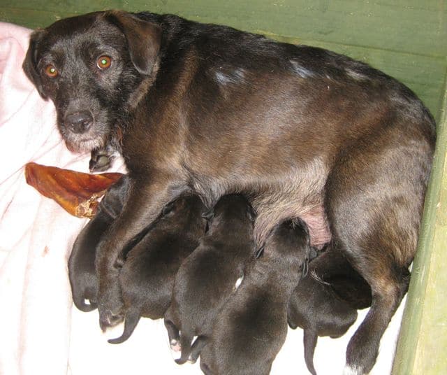 She’s a natural mother – Rosie loves puppies and especially patient and kind with them. We’re giving her frequent meals – she looks as though she’s the kind of dog who ‘gives’ all her nutrition to the puppies, already they are little butter-balls!