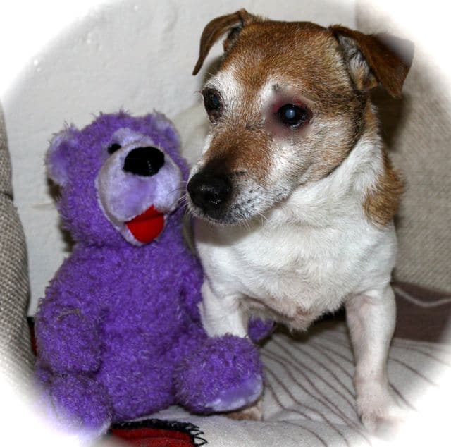 Little Billy’s health had improved amazingly since he’d been brought in. This elderly Jack Russell, had Lupus, which is a horrid disease leading to skin inflammation and depression. We put him on an organic natural diet and he thrived from the start. His eyes, which had been red raw, healed up and he became more energetic. Within weeks his quality of life improved dramatically. He was as good as gold, always smiling and the sweetest little chap possible. A personality plus dog, he was a pleasure to care for, always good tempered even when we were putting cream (aloe vera suited him) on his sore places. His face was always smiling, he was cheerful and pleased to see everyone.