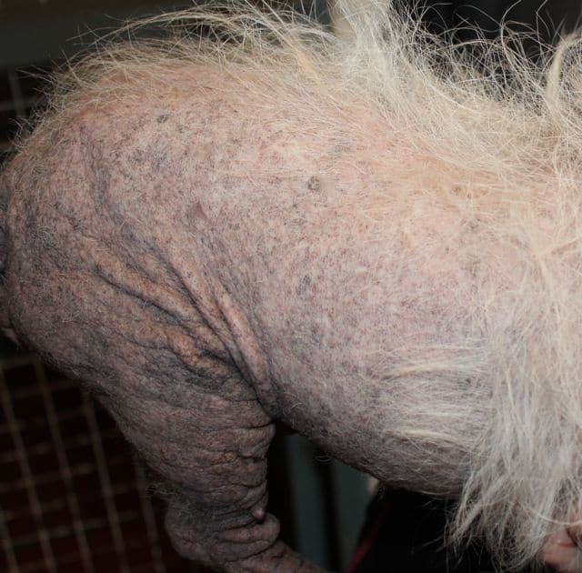 Sally has put a lot of weight on and she’s a happy little girl now. Her skin is soft and not so leathery, which is amazing because it looked as though it could never change. She still has one or two inflamed spots but not red all over as she was at first. And her hair is definitely growing back, she has fluffy little tufts in most places now.