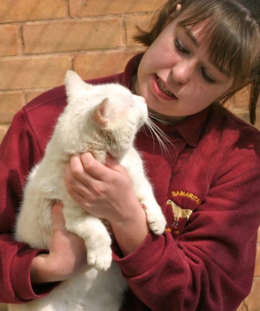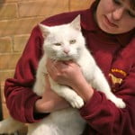 Samson is about three years old and has been neutered and vaccinated. Unlike some of the white cats he has perfect hearing and the most beautiful limpid green/grey eyes. Please do come and meet him if you are looking for a new feline friend, he is a favourite, undemanding and polite member of the sanctuary team and we would love to find him a wonderful home.