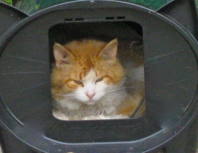 Sevvy looks to be apermanent resident now and is already looking much fatter and better. He was a raggedy cat in his wild outdoor days. He has plenty of opportunity to escape but obviously doesn ‘t want to. I’m guessing that he eats at night when there’s no one around. Will we ever get to stroke him? Pick him up even? It didn’t seem likely a few months ago – now, thanks to the Katcasbin (kindly donated by one of our Pet Samaritan friends) who knows?