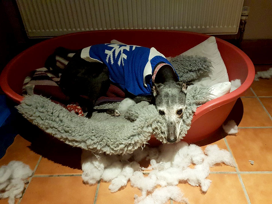 It’s been so cold, persuading the dogs to go out for toilet breaks has took some doing. Zeta our resident oldie didn’t fancy going out in the snow on her usual rounds to inspect the animals. Much too cold. Instead she decided to make her own snow indoors!