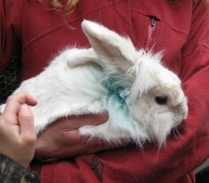 Pet of the Week is Snowy, one of our rabbit residents. He’s a lovely chap with a bit of the ‘Lion Head’ breed about him, he has a nice fluffy ruff round his head. And no, he isn’t especially a Sheffield Wednesday fan, he’s blue and white because of the spray we put on a sore place on his neck. It was caused by his fur being so matted that it had pulled the skin away leaving an open wound. It was infected and this is what usually happens when it’s not dealt with quickly. Check any long haired animal over for knotted and matted hair on a regular basis.