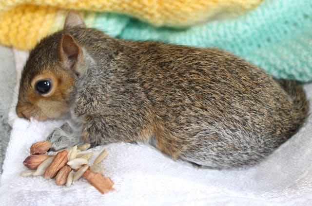 When the postman brought our mail this lunchtime, he brought us a special delivery – a baby squirrel! This little one was wrapped up in the postman’s jacket. He’d been found at the edge of a road on the outskirts of Chesterfield, people passing by didn’t seem to notice him lying there, this alert postman spotted him right away. He was flaked out and comatose, here was another one but sadly it was too late for him.