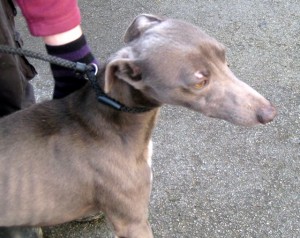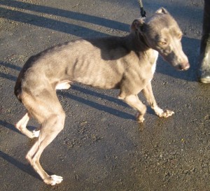 Whippets are normally streamlined but this poor chap is much too thin. You can almost see every bone in his body and he has knocks and cuts all over. There’s little wonder he is so upset, he must feel sore and he is ravenously hungry. When dogs get into this sort of state, even young ones like this one, it takes a lot of t.l.c. and care to pull them round. We give them small very nourishing meals very often so they can digest what they are eating more easily. Sometimes it’s not until they relax and feel safe and well again that we see the first improvement. Let’s h