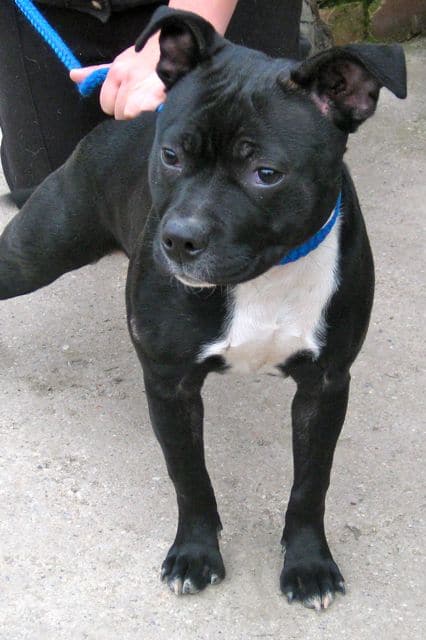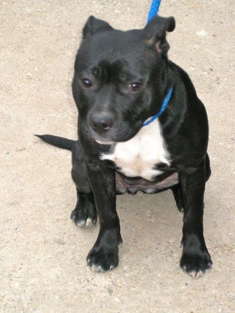 Marcy is clean and well behaved, like all puppies she wants to please and is so good natured. She’s not very tall (those little staffi legs again!) so she’ll not be very big even when fully grown. Her coat is jet black and glossy and she is well marked with a nice white bib.