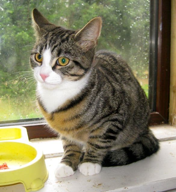 Such a handsome kitten with golden eyes, a white bib and paws and lovely tiger stripes. Toby is an exceptional kitten with a lovely personality too. He came in through no fault of his own and is litter trained and at, 16 weeks old is eating well.