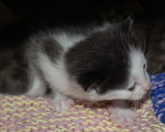 The five kittens who were born last week are still in the nest, they are just starting to open their eyes. Even at this age you can tell the difference in their personalities – the one at the front shown here is the explorer. He’s always edging to come out and if he does shuffle too far forwards his mum picks him up and puts him back. We have a name for him already and it’s Marco – because he’s an adventurer.