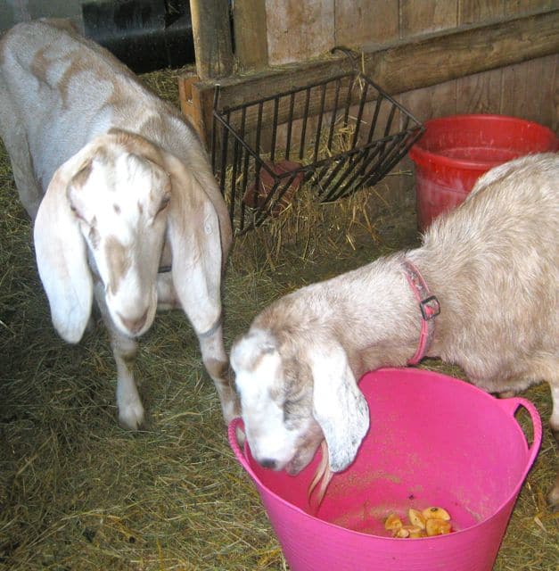 Buffy, the goat on the left, may be bigger but when it comes to windfall apples, Biscuit is the boss-goat. She’s trying to keep them all for herself so we had to settle matters by getting another feed dish and chopping some more apples up.