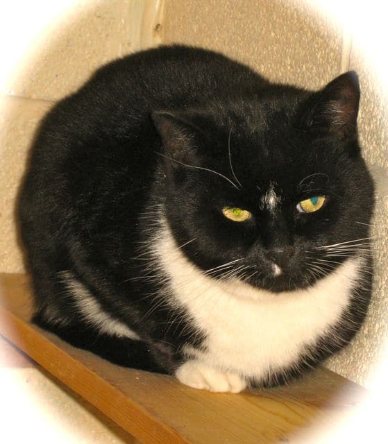 Timothy has big white big and white socks on his front feet, white stockings on his hind legs. He is very handsome. Tim likes to be fussed and picked up and cuddled but can amuse himself, mostly by watching the world go by and dreaming about fish suppers!