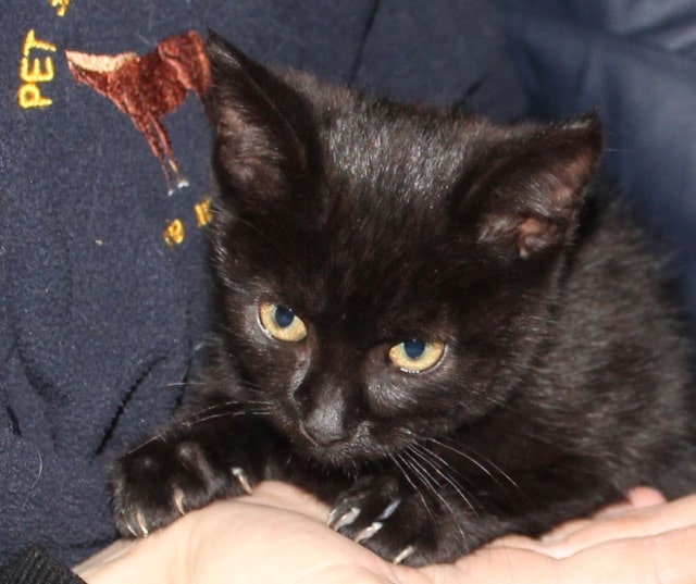 Toffee looks black but she is really a dark tortie, there are flecks of brown in her coat. She has a sad face at the moment but that will all change when she gets a new and loving home. We think she’s around nine weeks old, she might be older because she is small through malnutrition.