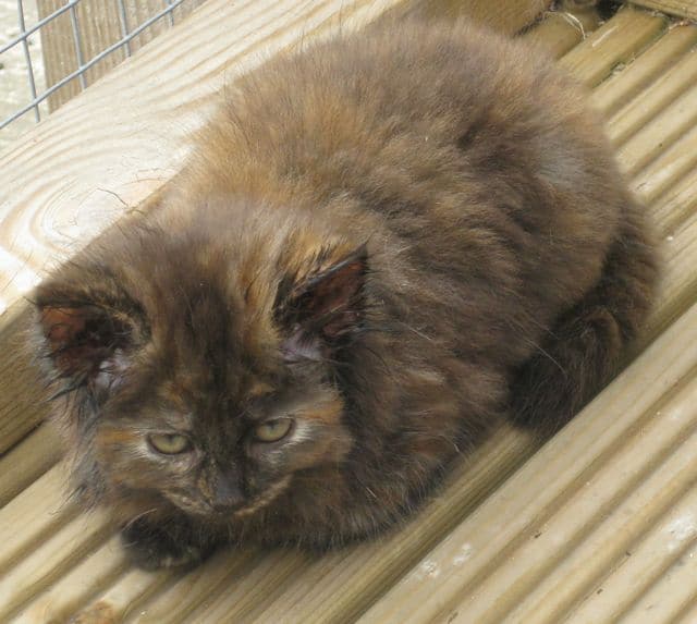 Missy is a lovely colour, with smudges of ginger, brown and black – a proper tortie. Her coat is a bit longer than normal and she is slightly fluffy and very pretty. Her eyes are amber. If you’d like to come and meet her please get in touch. By email is best as our ansaphone gets full every day even before lunch time.