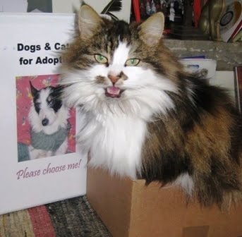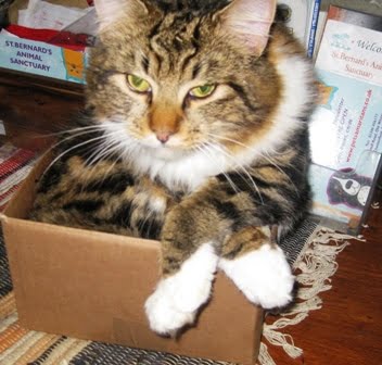 Delilah has one of these insistent purrs when she’s hungry and a quite different tone when she’s on your lap and kneading away with her front paws and ‘making puddings’. Why do cats do that? It’s always when they’re happy and has something to do with making a nest and patting the grass down. Cats also purr when they have kittens – this is a lovely contented sound. It’s to pattern the kits into knowing their mother and as a marker for them to get back to if they stray. Kittens have the purr mechanism in place at a very early age and can purr before they even open their eyes. Mostly they’re too busy suckling and sleeping to bother though. Occasionally cats will purr when they are distressed, it may be a comfort aid when they are in trouble. The feline purr is certainly a very unique feature. And why do cats squash themselves into tiny boxes? No one knows the answer to that one. Purr, purr, purr…..