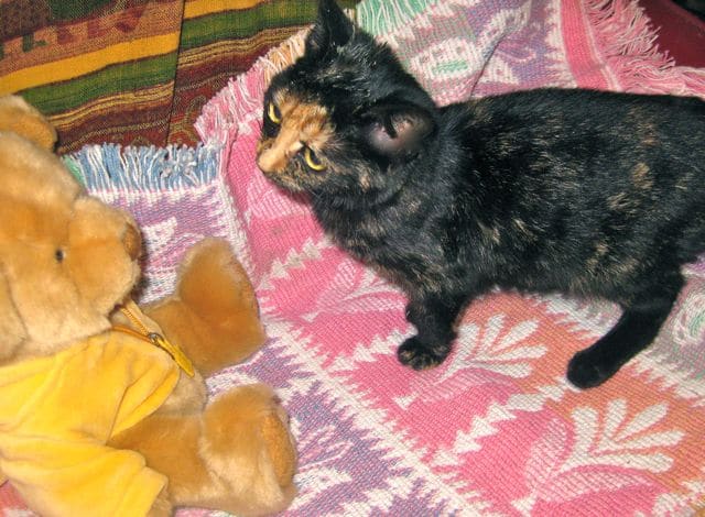 Wispa is improving, her appetite is better and she’s eating hungrily, although still not much at a time. She is underdeveloped so it will take a time for her to pick up, she might always be a small cat but it does look as though she is going to pull through. Whether she’ll ever make a strong healthy cat only time will tell. Although she still looks sad, Wispa is moving about more and had a little play yesterday which is the first so far. Her miaow is non-existent, she tries when she is ready for more food (meals are little and often) but no sound comes out! Maybe she did so much miaow-ing when she was out alone that she lost her voice. The medication from the vet is doing her a lot of good although it is very difficult to give it to her without stress, she seems terrified of anything out of the normal. Crushing the tablets and hiding the powder in her food is the best way, when this little kitty doesn’t want you to do something she really means it.